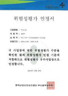 위험성평가 우수기업 인증서